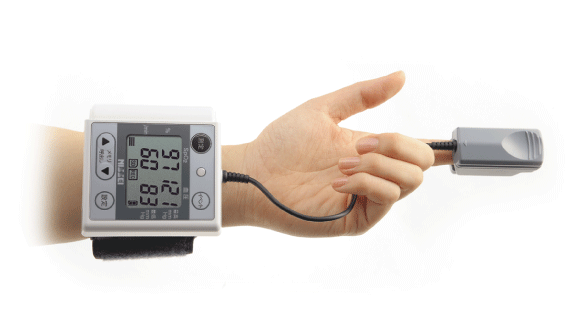 手首と指先に装着し、最高・最低血圧、脈拍数、血中酸素飽和度を測定します。治療前・治療中・治療後の患者さんの状態を確認します。