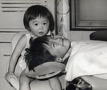 父の診療室には小さい頃から出入りしていたらしいです。中でも傑作なエピソードは「おんぶ紐だっこ事件」でしょう。いつものように診療している中、ある患者さんをお呼びしに待合室へ行った時です。先ほどまでお待ちいただいていたのに、いらっしゃらない。会社の社長さんですから、急用でもできたのかしらと外を見ると…そう、僕をおんぶ紐で結わいて、抱っこしている社長さん。僕がおんぶ紐を手に待合室にフラフラやって来て、「抱っこしてくれ」と。何かいい時代だったんですね。