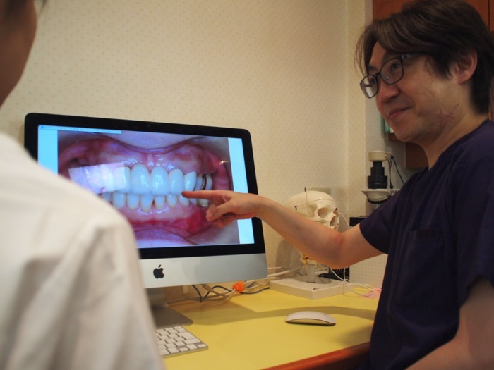 オリエント歯科ではご自身の現在の状態を正しく理解していただくため、初診時にはお口の中の写真やレントゲン写真を撮らせていただいたき、それらを元になるべく分かりやすくご説明するように心がけております。細かな説明などお求めにならない方は、もしかするとご面倒に感じられるかもしれません。治療方針につきましても、ご本人さまにも共に考えていただき、ご相談をして決めたいと考えます。 「痛いところだけ」「外れたところだけ」「とりあえず作り直して」という治療では、その背後にある問題点(例えばかみ合わせの問題であったり、歯ぐきがよくなかったり、悪い癖があったりなど)を考慮しない、行き当たりばったりのその場しのぎの治療になりがちです。このような治療をしないために、患者さんのお口全体を見渡した治療を行う必要もあるのです。治療方針につきましては、ご本人さまにも共に考えていただき、ご相談をして決めたいと考えます。もちろん、無理に治療をお勧めすることはありませんので、ご安心ください。 また、治療の流れとして歯周病治療を軸に進めたいと考えておりますでの、場合によっては望まれていた治療の流れと異にする場合もあるかもしれません。当方といたしまして、ご理解いただけますようご説明いたしたいと思います。