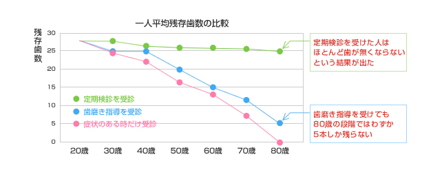 下図は、年代別の歯科医院のかかり方と残っている歯の数を示したグラフ(長崎大学 新庄教授のデータ)です。 定期的にお口の中のケアを受けることにより、大切な歯をあまり失わなずにすむということがよく分かります。これは、とてもインパクトのある研究ではないでしょうか。