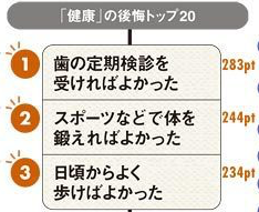 「リタイヤ前にやるべきだった後悔トップ20〜健康編〜」というアンケート(55歳から74歳の男女1,000人調査:プレジデント2012年11月号)の第1位は「歯の定期検診を受ければよかった」というものでした。 むし歯も歯周病も悪化が進めば進むほど治療が困難になり、期間や費用もかかってきます。また、歯を欠損すると食事の楽しみも半減してしまうという切実な思いからなのでしょう。