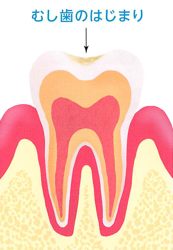 むし歯は、口の中にいる細菌が酸を出して歯を溶かす現象です。 歯の表面におけるごく初期の段階では、溶けた部分が元にもどることがわかってきました(この現象を再石灰化とよんでいます)。このような場合は、フッ素を利用したり、再石灰化が期待できる様なタブレットやガムを使用していただきます。