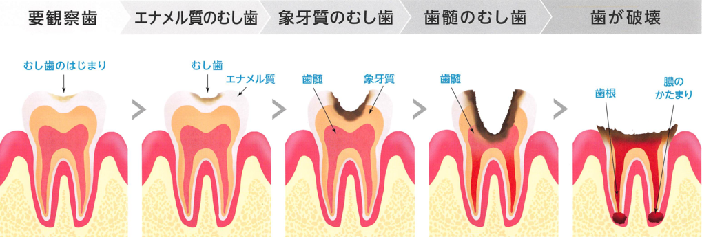 むし歯の進行の仕方や症状は人さまざま、なってしまった歯やそのなる場所によってもいろいろなかたちを示します。