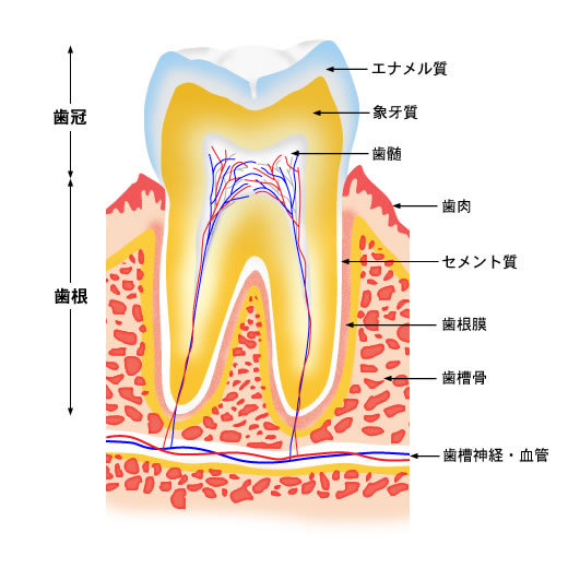歯にむし歯ができると痛みを感じますよね。これは、歯の中の歯髄(しずい)と呼ばれる部分に、神経が通っているからです。歯髄には神経の他に血管が通っています。この硬い歯にも血が通っているんですよ。これで、歯に酸素を運んだり、免疫などの防御反応を伝達するなど重要な役割をしているのです。