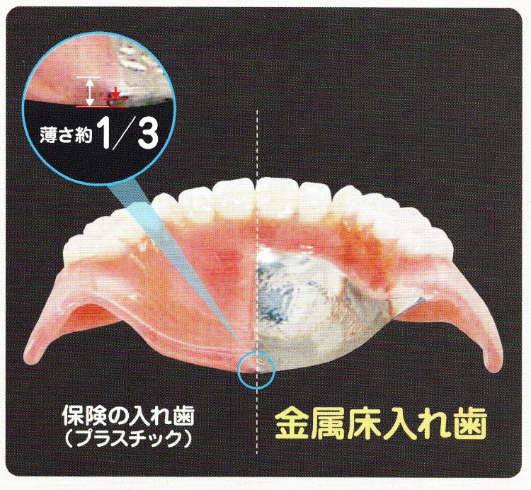 金属床の入れ歯は保険の樹脂のみでできた入れ歯の約1/3の薄さです。お口の中で違和感が少なく快適です。