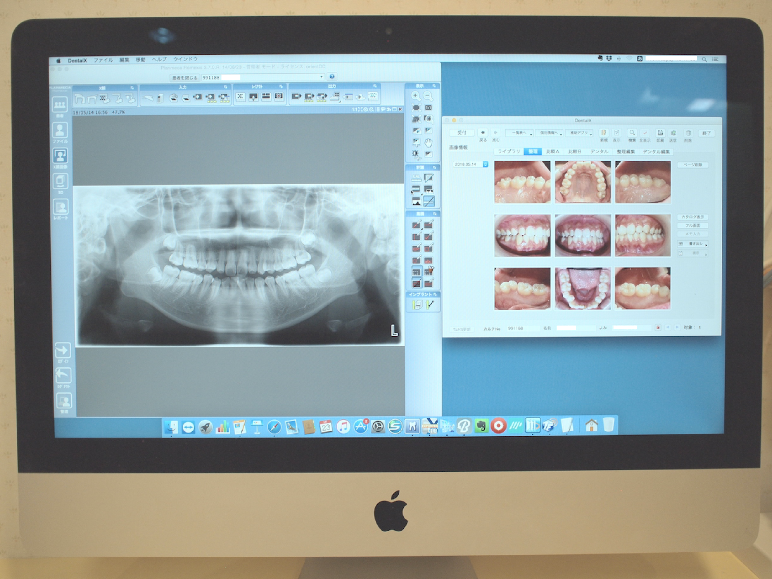 オリエント歯科では、まずはスタートとして、ご自身のお口の中がどういう状態なのかということをお伝えしているようにしています。そのため、受診された方のお口の中の写真を撮らせていただいています。正面から、右側から、左側から、上顎全体、下顎全体、右上、右下、左上、左下と9枚記録させていただくことが多いです。また必要に応じてレントゲン写真を撮らせていただきます。