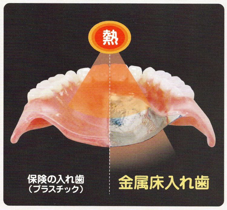 金属床の入れ歯は温度をよく伝えるので、温かいものは温かく、冷たいもの冷たく、美味しく食事が楽しめます。