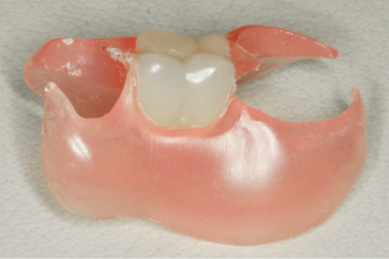 1本歯がなくなってしまい、前後に歯が残っている場合には、この材質のみのデザインでも大丈夫かと思いますが、多数歯がなくなってしまった場合には骨組み部分には金属を使用しないといけないのでは思っています(金属床義歯の項、参照)。