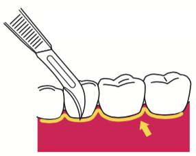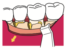 基本的な治療で治りきらない場合には、歯周外科治療を行うことがあります。これには、外側からのスケーリング・ルートプレーニングでは届かない歯石を歯ぐきを切開して徹底的に取り除いたり、治療後に残る歯周ポケットをプラークが溜まりにくくなるように浅くする手術のことをいいます。中等度から重度の患者さん向けの治療です。