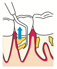 そこで、歯ぐきに隠れたプラークと歯石を徹底的に取り去るために、歯科医院ではスケーリング・ルートプレーニングを行います。特に歯ぐきの中に隠れた部分(歯肉縁下)のスケーリング・ルートプレーニングは、歯周治療の鍵となります。この歯肉縁下のスケーリング・ルートプレーニングで、プラークと歯石を徹底的に取り除けば、多くの歯周病が治ります。しかし、見えない部分へのアプローチだけに、その限界もあります。深すぎて器具が届かない場合や複雑な根の形のため器具をあてる角度が難しい場合には、外科処置が必要になります。